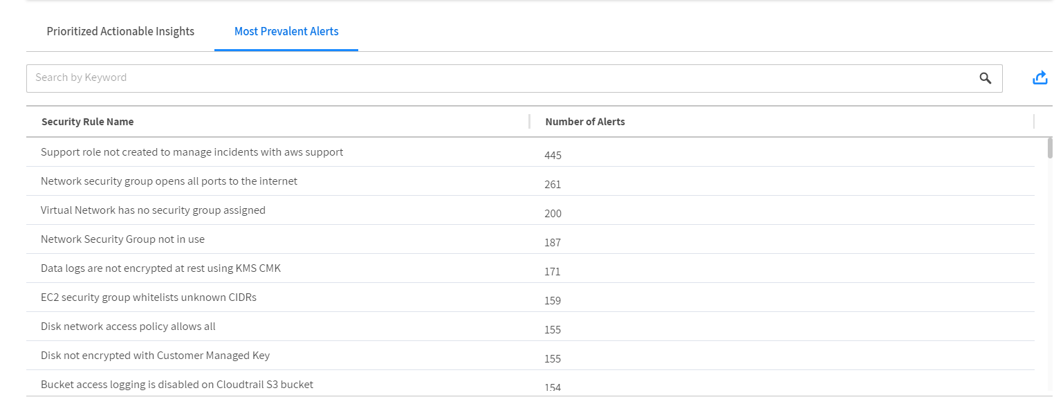 The shows the most common alerts detected in your environment. You can export the complete list of alerts.